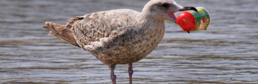 Foto principal: Una joven gaviota plateada (Larus argentatus) con basura plástica en el pico, en Newquay, Cornualles, Reino Unido. Foto: Education Images, UIG/Getty